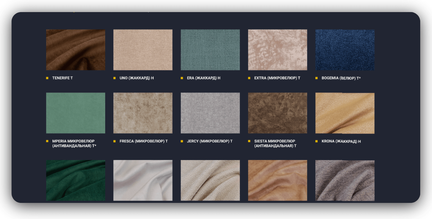 На четвертом экране лендинга представлена информация о широком ассортименте материалов и вариантов исполнения мебели, проиллюстрированные качественными фотографиями.