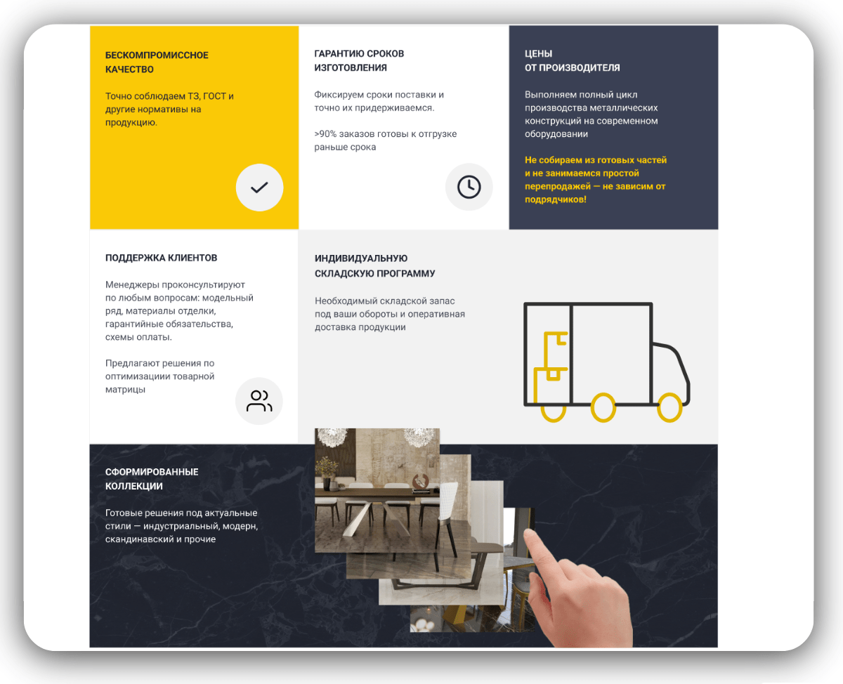Далее акцентируется внимание на важных преимуществах компании для мебельных магазинов и других клиентов: Высокий доход с квадратного метра экспозиции, более 100 модификаций и сотни комбинаций исполнений, бесплатное предоставление маркетинговых материалов, сформированные коллекции в разных стилях.