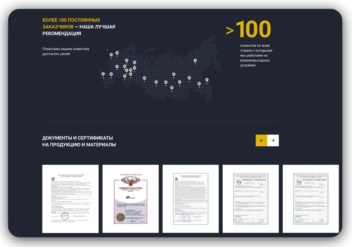 Далее указывается, что компания предоставляет гарантию на свою продукцию сроком 18 месяцев, а также размещена информация о наличии у продукции сопроводительной документации: паспорт изделия, гарантийный талон, требования к эксплуатации. Это свидетельствует о высоком качестве и надежности продукции и увеличивает доверие посетителей лендинга к компании.